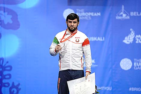 26 чэрвеня, Мінск /Кар. БЕЛТА/. Цырымонія ўручэння сярэбранага медаля Алімпійскіх гульняў - 2008 беларускаму барцу Мураду Гайдараву адбылася сёння ў Палацы спорту на турніры па барацьбе II Еўрапейскіх гульняў, перадае карэспандэнт БЕЛТА.