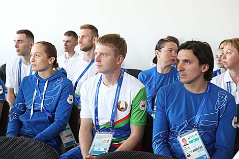 20 чэрвеня, Мінск /Кар. БЕЛТА/. Прэм'ер-міністр Сяргей Румас сустрэўся з членамі спартыўнай дэлегацыі Беларусі на II Еўрапейскіх гульнях у Вёсцы атлетаў у Мінску, перадае карэспандэнт БЕЛТА.