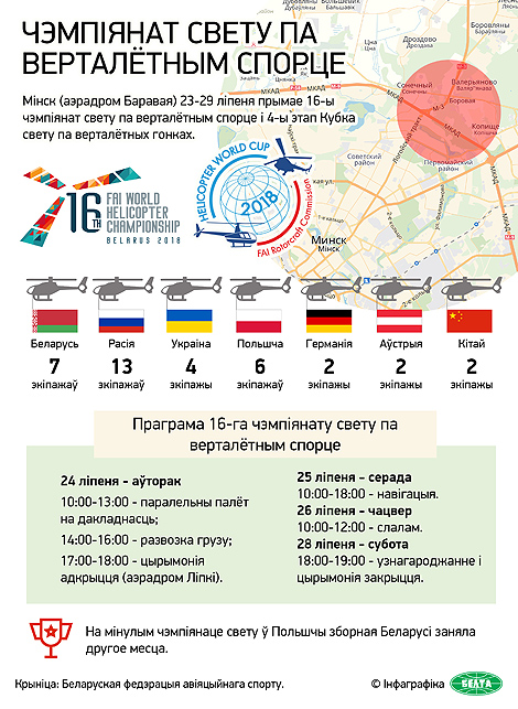 Асноўныя спаборніцтвы пройдуць на аэрадроме Баравая. Згодна з праграмай чэмпіянату спаборніцтвы пачнуцца 24 ліпеня ў 10.00 з практыкавання "Паралельны палёт на дакладнасць", затым адбудзецца "Паралельная развозка грузаў". У цэлым удзельнікі будуць спаборнічаць у выкананні чатырох практыкаванняў: "Навігацыя", "Паралельны палёт на дакладнасць", "Паралельная развозка грузаў" і "Паралельны слалам". Нацыянальныя каманды выступаюць на двух тыпах верталётаў Мі-2 і Робінсан-44.