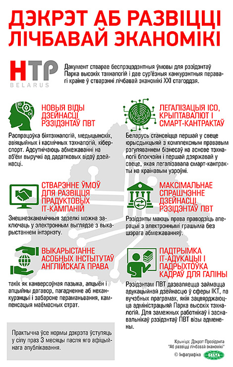 Дакумент стварае прававыя ўмовы для правядзення ICO, выкарыстання крыптавалюты і ўкаранення смарт-кантрактаў. Беларусь становіцца першай у свеце юрысдыкцыяй з комплексным прававым рэгуляваннем бізнесаў на аснове тэхналогіі блокчэйн. Дэкрэт не прадугледжвае ніякіх абмежаванняў і спецыяльных патрабаванняў да аперацый па стварэнні, размяшчэнні, захоўванні, адчужэнні, абмене токенаў, а таксама дзейнасці аператараў крыптаплатформ і аператараў абмену крыптавалют. Дзейнасць па майнінгу, набыцці, адчужэнні токенаў, якая ажыццяўляецца фізічнымі асобамі, не з'яўляецца прадпрымальніцкай дзейнасцю, а токены не падлягаюць дэклараванню.