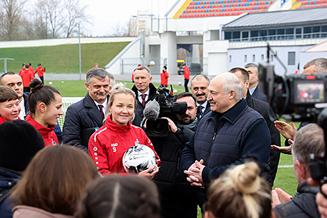 А на стадыёне Прэзідэнт паразмаўляў з юнымі футбалістамі клуба "Мінск". Аляксандр Лукашэнка расказаў, як у свой час займаўся гэтым відам спорту, а яны ў сваю чаргу папрасілі кіраўніка дзяржавы пакінуць аўтограф на мячы - цяпер ён зойме пачэснае месца ў музеі клуба.