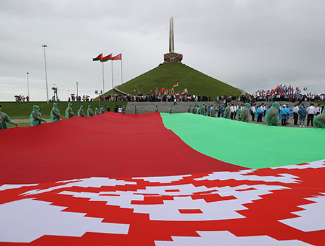 "Больш як год яны прывозілі жмені зямлі з гарадоў-герояў, раёнаў партызанскага руху. Зямлі, якая ўвабрала ў сябе слёзы маці, жонак і дзяцей загінулых воінаў, боль страт мільёнаў загубленых жыццяў", - сказаў беларускі лідар.