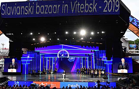 "У гэты ўрачысты вечар хачу шчыра вітаць усіх, хто сэрцам адгукнуўся на пазыўныя міжнароднага фестывалю мастацтваў "Славянскі базар". Усіх, дзякуючы каму не проста горад, а ўся наша Беларусь у літаральным сэнсе жыве мастацтвам, гучыць музыкай фестывальнага лета, гаворыць на розных мовах. Мы рады ўсім, хто прыехаў да нас, каб далучыцца да гэтага прыгожага свята - сапраўднага свята мастацтва, дружбы і ўзаемаразумення", - сказаў Аляксандр Лукашэнка.