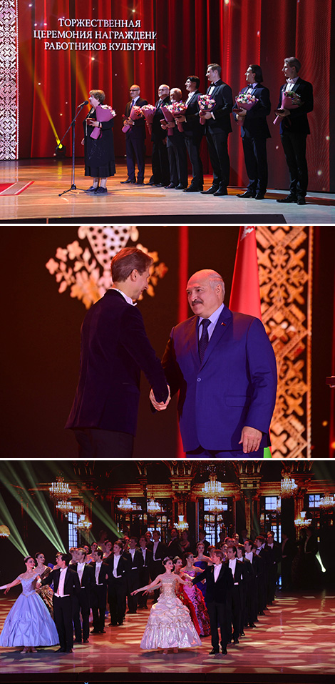 Прэзідэнт уручыў нагрудныя знакі да ганаровых званняў "Заслужаны дзеяч культуры" - мастаку-скульптару прафесару кафедры скульптуры Беларускай дзяржаўнай акадэміі мастацтваў Аляксандру Фінскаму, "Заслужаны артыст" - артысту балета Дзяржаўнага акадэмічнага ансамбля танца Аляксандру Глазко, мастацкаму кіраўніку Музычнага прадзюсарскага цэнтра "Залатыя галасы" Валерыю Шмату і вядучаму майстру сцэны Нацыянальнага акадэмічнага драматычнага тэатра імя М.Горкага Руслану Чарнецкаму. Нагрудны знак да ганаровага звання народнага артыста Беларусі ўручаны артысту балета (салісту) - вядучаму майстру сцэны Нацыянальнага акадэмічнага Вялікага тэатра оперы і балета Антону Краўчанку і артысту драмы, вядучаму майстру сцэны Нацыянальнага акадэмічнага тэатра імя Янкі Купалы Тамары Міронавай.