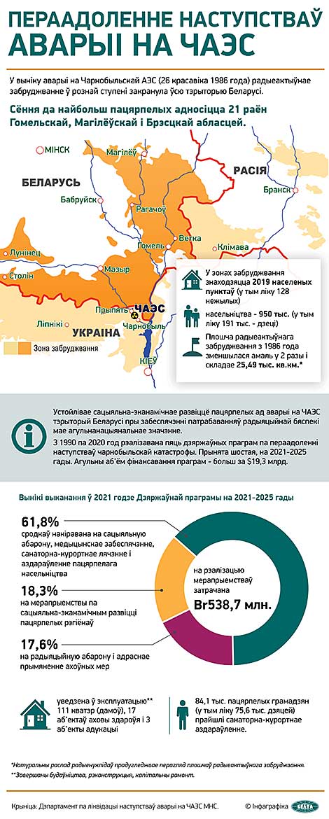 Цяпер у Беларусі рэалізуецца шостая дзяржаўная праграма па пераадоленні наступстваў катастрофы на Чарнобыльскай АЭС да 2025 года. Агульны аб'ём фінансавання па ёй складае амаль Br3 млрд. На выкананне папярэдніх пяці праграм з 1990 года было накіравана больш за $19 млрд.