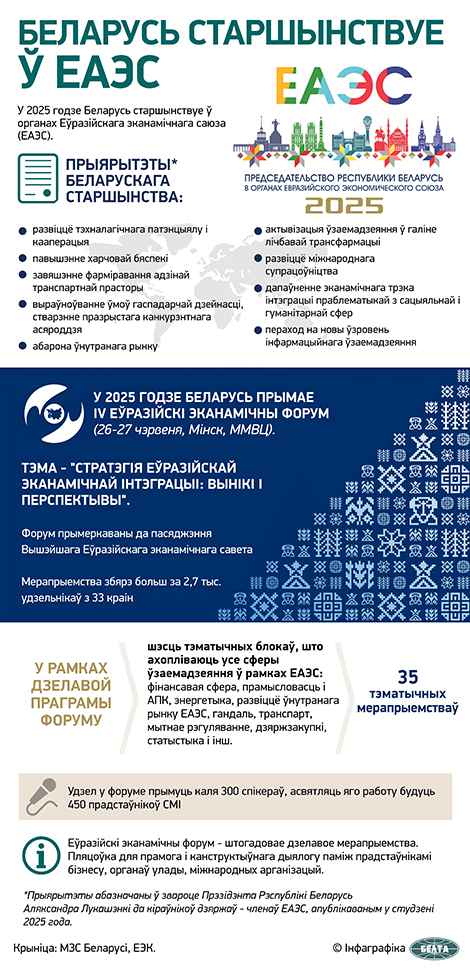 Аляксандр Лукашэнка нагадаў, што ў бягучым годзе Беларусь старшынствуе ў органах ЕАЭС. А Еўразійскі эканамічны форум - самая маштабная адкрытая дыскусійная пляцоўка аб'яднання.