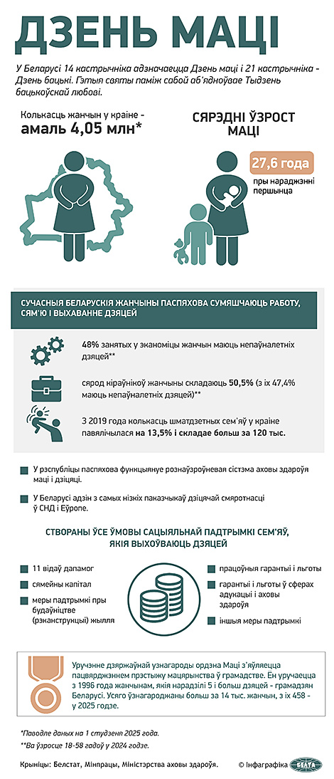 "Нізкі паклон вам, дарагія мамы. Жадаю моцнага здароўя і дабрабыту. Няхай шчаслівы бляск дзіцячых вачэй натхняе вас на новыя здзяйсненні", - дадаў Аляксандр Лукашэнка.