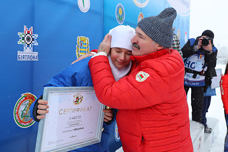 5 сакавіка, Мінскі раён /Кар. БЕЛТА/. Прэзідэнт Беларусі Аляксандр Лукашэнка 4 сакавіка прыняў удзел у цырымоніі ўзнагароджання пераможцаў і прызёраў рэспубліканскіх спаборніцтваў сярод дзяцей і падлеткаў па біятлоне "Снежны снайпер" на прызы Прэзідэнцкага спартыўнага клуба, перадае карэспандэнт БЕЛТА.