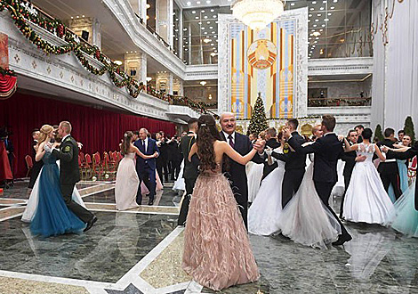 28 снежня, Мінск /Кар. БЕЛТА/. Прэзідэнт Беларусі Аляксандр Лукашэнка сёння на першым Рэспубліканскім навагоднім балі для моладзі ў Палацы Незалежнасці танцаваў вальс з "Міс Беларусь - 2018" Марыяй Васілевіч, перадае карэспандэнт БЕЛТА.