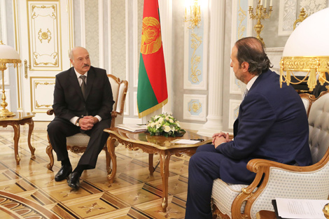 5 красавіка, Мінск /Аліна Грышкевіч - БЕЛТА/. Прэзідэнт Беларусі Аляксандр Лукашэнка сёння сустрэўся з міністрам па справах палаца Прэзідэнта Сірыйскай Арабскай Рэспублікі Мансурам Азамам, перадае карэспандэнт БЕЛТА.