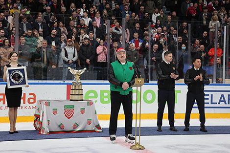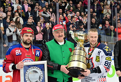 Прэзідэнт адзначыў, што ўважліва сачыў за фінальнай серыяй чэмпіянату. "Вы малайцы. Вы аддалі сябе цалкам гэтай гульні, - падтрымаў хакеістаў кіраўнік дзяржавы. - Вы падарылі беларускаму народу і людзям, якія прыйшлі ў гэту залу, і мне ў тым ліку, выдатную гульню. Мужчынскую гульню. Сапраўдны хакей".