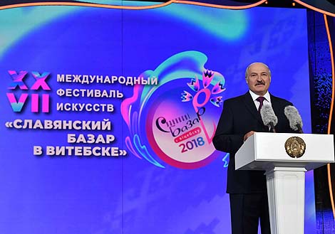 Кіраўнік дзяржавы адзначыў, што з году ў год "Славянскі базар" напаўняе летняе жыццё Віцебска музычнымі рытмамі, ператварае пейзажы горада над Дзвіной у вялікую творчую майстэрню, дзе мастакі адкрываюць для гасцей фестывалю свет старажытных і сучасных традыцый народнага мастацтва.