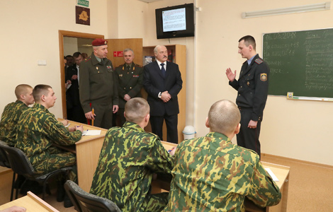 Прэзідэнт азнаёміўся з умовамі быту ваеннаслужачых - наведаў клас спецыяльнай падрыхтоўкі, дзе ў гэты момант праходзілі заняткі, пакой для правядзення вольнага часу і інфармавання, трэнажорную залу.