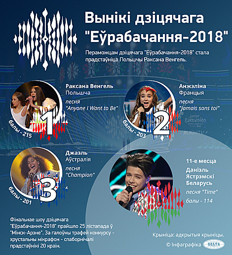 26 лістапада, Мінск /Кар. БЕЛТА/. Пераможцам дзіцячага "Еўрабачання-2018" стала прадстаўніца Польшчы Раксана Венгель, канкурсант ад Беларусі Даніэль Ястрэмскі - 11-ы, перадае карэспандэнт БЕЛТА.