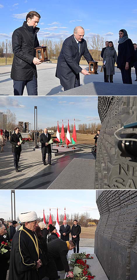 Аляксандр Лукашэнка і Себасцьян Курц устанавілі запаленыя лампады ля манумента "Брама памяці". Пасля выступлення перад прысутнымі Прэзідэнт Беларусі і федэральны канцлер Аўстрыі пад гукі жалобнай музыкі ўсклалі кветкі да помніка "Масіў імёнаў" і мінутай маўчання ўшанавалі памяць загінулых.