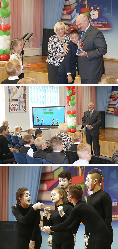 Кіраўнік дзяржавы таксама прыняў удзел у святочным мерапрыемстве да Дня ведаў, у час якога выступілі калектывы ўзорнага дзіцячага тэатра пантамімы "Спадарожнік" і студыі жэставай песні "Гаворачыя рукі". Пасля завяршэння канцэрта навучэнцы школы-інтэрната ўручылі Аляксандру Лукашэнку памятны падарунак.