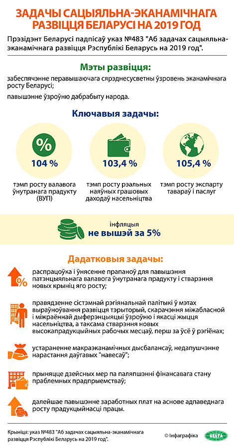 У адпаведнасці з указам мэтай сацыяльна-эканамічнага развіцця на 2019 год з'яўляецца забеспячэнне эканамічнага росту Беларусі, што перавышае сярэднесусветны ўзровень, і павышэнне на гэтай аснове ўзроўню дабрабыту беларускага народа.