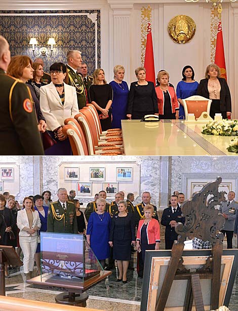 Аляксандр Лукашэнка павіншаваў удзельнікаў цырымоніі з заслужанымі дзяржаўнымі ўзнагародамі і ўручыў ім ордэны і медалі, дыпломы аб прысваенні ганаровых званняў і пагоны вышэйшаму афіцэрскаму складу. "Няхай у вашых дамах пануюць каханне, утульнасць, цяпло, а неба над роднай Беларуссю заўсёды будзе мірным", - пажадаў ён. Яшчэ раз звяртаючыся да жанчын, кіраўнік дзяржавы падкрэсліў: "Ваша жыццё і жыццё вашых дзяцей мы, мужыкі ў пагонах, забяспечым спаўна. Тым больш мы ў гэтым плане карыстаемся вашай падтрымкай. Я ўжо гаварыў, што мужчынскае свята, якое прайшло, мы раздзялілі з вамі, жанчынамі. Таму што жанчына ў пагонах - гэта не навіна, і мы ўсе абаронцы нашай Айчыны".