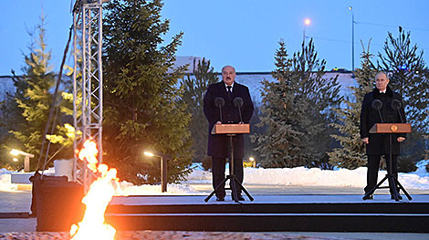 Прэзідэнты Беларусі і Расіі ўсклалі кветкі да Вечнага агню, агледзелі мемарыяльны комплекс.