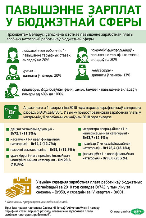 Акрамя таго, прадугледжваецца павышэнне з 1 кастрычніка 2018 года тарыфнай стаўкі першага разраду з Br34 да Br35,5 работнікам бюджэтнай сферы ў цэлым.