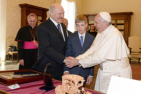 Яна прадаўжалася каля 40 мінут, з іх 25 мінут Прэзідэнт і пантыфік размаўлялі ў фармаце "сам-насам". Аляксандр Лукашэнка падарыў пантыфіку копію крыжа Ефрасінні Полацкай, мадэль карэты і галаграфічны абраз. А яшчэ запрасіў Францыска ў Беларусь. Папа Рымскі, у сваю чаргу, падарыў Прэзідэнту тры напісаныя ім дакументы аб Евангеллі, ахове прыроды і сям'і. Яшчэ адным падарункам пантыфіка стала мастацкая выява аліўкавага дрэва, якое з'яўляецца сімвалам міру.