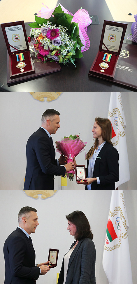 26 верасня, Мінск /Кар. БЕЛТА/. Знакамітая беларуская плыўчыха Аляксандра Герасіменя і яе трэнер Алена Клімава ўзнагароджаны медалямі Нацыянальнага алімпійскага камітэта Беларусі "За выдатныя заслугі", перадае карэспандэнт БЕЛТА.