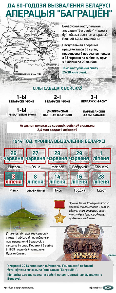Беларуская наступальная аперацыя "Баграціён", якая прывяла да вызвалення ўсёй тэрыторыі Беларусі летам 1944 года, прадаўжалася 68 сутак - з 23 чэрвеня па 29 ліпеня 1944 года, і не мела роўных па прасторавым размаху і аператыўна-стратэгічных выніках. Яе мэтай быў разгром групы армій "Цэнтр" і вызваленне Беларусі. І гэта мэта была дасягнута поўнасцю. Нашы войскі выйшлі на дзяржаўную граніцу СССР. Наперадзе было вызваленне ўсёй Еўропы.