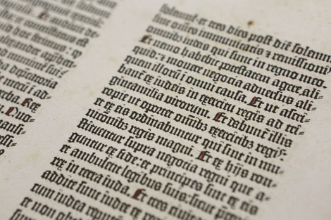 Біблія Гутэнберга традыцыйна лічыцца пунктам адліку гісторыі кнігадрукавання ў Еўропе і паваротным момантам у пераходзе ад сярэдневякоўя да сучаснага свету. Кніга, надрукаваная гатычным шрыфтам, прызнана шэдэўрам прыгожага друку і мастацкага майстэрства. Біблія поўнасцю надрукавана ў дзве калонкі. Вялікія літары і загалоўкі выкананы ўручную з варыяцыямі малюнка.