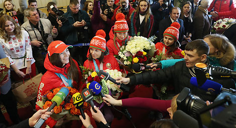 27 лютага, Мінск /Кар. БЕЛТА/. Алімпійскія чэмпіёнкі па біятлоне ў эстафеце 4х6 км Надзея Скардзіна, Ірына Крыўко, Дзінара Алімбекава і Дар'я Домрачава, а таксама каманды па канькабежным спорце, лыжных гонках, гарналыжным спорце, медыцынская і адміністрацыйная групы вярнуліся сёння з Пхёнчхана, перадае карэспандэнт БЕЛТА.