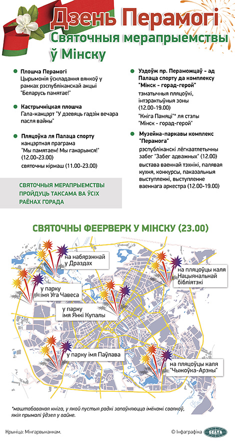 Дзень Перамогі ў гэтым годзе пройдзе без парада, але вечарам у 23.00 можна будзе паназіраць святочны салют у шасці кропках. У іх ліку парк Я.Купалы, "Чыжоўка-Арэна", парк імя Уга Чавеса, Нацыянальная бібліятэка і парк імя Паўлава.