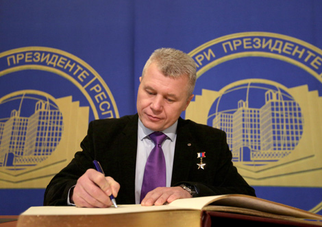 У час сустрэчы касманаўт адказаў на пытанні студэнтаў і распісаўся ў Кнізе ганаровых гасцей Акадэміі кіравання пры Прэзідэнце.