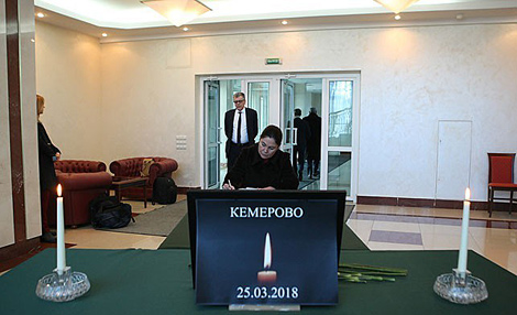 28 сакавіка, Мінск /Кар. БЕЛТА/. Кніга спачуванняў у сувязі з трагедыяй, якая здарылася ў гандлёвым цэнтры "Зімняя вішня" ў Кемераве, адкрыта ў пасольстве Расіі ў Беларусі 28 сакавіка. Аб гэтым карэспандэнту БЕЛТА паведаміў прэс-сакратар расійскай дыпмісіі Аляксей Маскалёў.