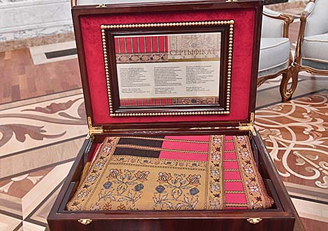 Аляксандр Лукашэнка падарыў Эмамалі Рахмону створаную па старадаўняй тэхналогіі копію слуцкага пояса, а таксама сувеніры II Еўрапейскіх гульняў - пано з моранага дуба з замацаванымі на ім медальёнамі, якія сімвалізуюць 15 відаў спорту, прадстаўленых на форуме, эксклюзіўны набор шакаладу і талісман II Еўрапейскіх гульняў - лісяня Лесіка.
