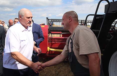 Выслухаўшы даклады аб сітуацыі з уборкай, Прэзідэнт накіраваўся да збожжаўборачнага камбайна "Палессе GS12 A1", які на полі сярод іншых убіраў збожжа. За штурвалам камбайна працаваў малады механізатар Аляксей Якаўлеў, у якога Аляксандр Лукашэнка пацікавіўся, як працуецца, ці ёсць якія праблемы, ці не ламаецца тэхніка. "Як наогул камбайн", - спытаў Прэзідэнт. На што механізатар упэўнена адказаў: "Выдатна".