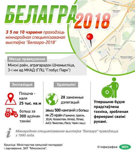 Акрамя "Белагра-2018" у час Беларускага аграпрамысловага тыдня з 5 па 10 чэрвеня ў Мінскім раёне пройдуць міжнародныя спецыялізаваныя выстаўкі "Белферма", "Белпрадукт", "Прадмаш. Холад. Упак".
