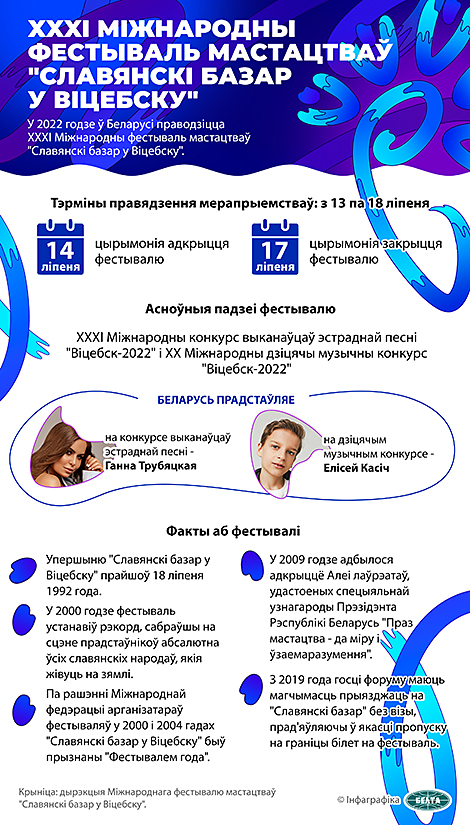 XXXI Міжнародны фестываль мастацтваў "Славянскі базар у Віцебску" пройдзе з 13 да 18 ліпеня. Адкрыццё фестывалю запланавана на 14 ліпеня, закрыццё – 17 ліпеня.