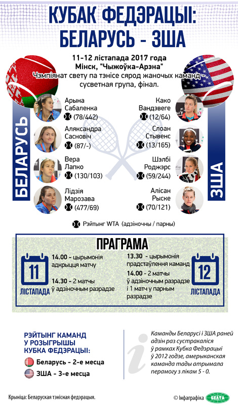 Да гэтага тэнісныя зборныя Беларусі і ЗША ў Кубку Федэрацыі сустракаліся паміж сабой толькі аднойчы: у лютым 2012 года амерыканкі перамаглі на сваёй арэне з лікам 5:0. Зборная Беларусі ўпершыню прабілася ў фінал, а каманда ЗША 17 разоў станавілася пераможцай Кубка Федэрацыі. У гэтым сезоне беларускія тэнісісткі па чарзе перамаглі ў Мінску саперніц з Нідэрландаў (4:1) і Швейцарыі (3:2), а амерыканкі таксама дома абыгралі зборныя Германіі (4:0) і Чэхіі (3:2). Цяпер у камандным рэйтынгу жаночых зборных Беларусь займае другую пазіцыю, ЗША знаходзіцца на трэцім месцы, а наперадзе каманда Чэхіі.
