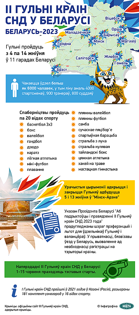 З 4 па 14 жніўня ў Беларусі пройдуць ІІ Гульні краін СНД. Канцэпцыя прадугледжвае арганізацыю спартыўных мерапрыемстваў ва ўсіх рэгіёнах рэспублікі. Цырымоніі адкрыцця і закрыцця, запланаваныя на 5 і 14 жніўня, пройдуць на "Мінск-Арэне". Падрыхтоўкай цырымоній займаецца Міністэрства культуры.