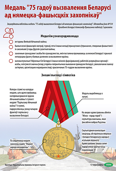 2 красавіка, Мінск /Кар. БЕЛТА/. Устаноўлены юбілейны медаль "75 год вызвалення Беларусі ад нямецка-фашысцкіх захопнікаў". Адпаведны ўказ нумар 134 Прэзідэнт Беларусі Аляксандр Лукашэнка падпісаў 2 красавіка. Аб гэтым БЕЛТА паведамілі ў прэс-службе беларускага лідара.