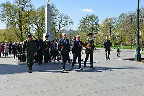 29 красавіка, Масква /Эдуард Півавар - БЕЛТА/. З нагоды 74-й гадавіны Перамогі ў Вялікай Айчыннай вайне ў Маскве ў Аляксандраўскім садзе адбылася цырымонія ўскладання вянка да Магілы Невядомага Салдата ад пасольства Беларусі ў Расіі і кветак да памятных абеліскаў "Горад-герой Мінск" і "Брэсцкая крэпасць-герой" каля Крамлёўскай сцяны, паведамілі БЕЛТА ў прэс-службе дыппрадстаўніцтва.
