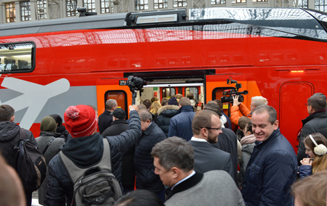 27 кастрычніка, Масква /Эдуард Півавар - БЕЛТА/. Першы двухпавярховы электрапоезд новага пакалення, выпушчаны на сумесным беларуска-швейцарскім прадпрыемстве ЗАТ "Штадлер Мінск", зрабіў сёння першы рэйс у Маскве з Кіеўскага вакзала ў аэрапорт Унукава, паведамілі БЕЛТА ў прэс-службе пасольства Беларусі ў Расіі.