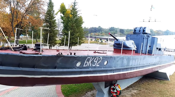 Сімвалічнымі элементамі кампазіцыі сталі бранякатар БК-92 і стэла з памятным надпісам. Помнік-карабель расказвае гісторыю шматнацыянальнага экіпажа, які адважна змагаўся і паў смерцю герояў, вызваляючы горад. Далей лесвіца з размешчанымі ўздоўж імёнамі загінулых вядзе да цэнтральнай часткі комплексу – стэлы з бронзавымі барэльефамі матроса, салдата і жанчыны. А каля яе падножжа гарыць Вечны агонь. Таксама з абодвух бакоў стэлы ўстаноўлены абеліскі на магілах Герояў Савецкага Саюза Ціхана Ігнатавіча Калініна і Аляксея Цімафеевіча Кулікова.