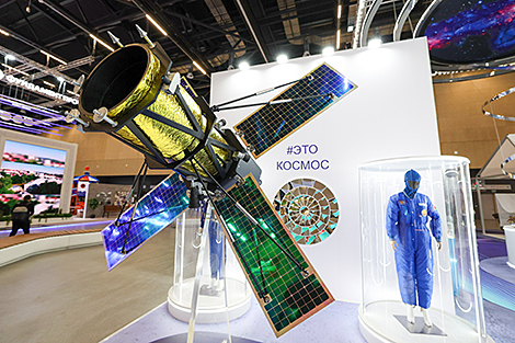 企业展台以航天为主题。亚历山德拉·斯马吉娜介绍道:“核心展品是计划于2028年发射的俄白未来航天器模型。该航天器由俄白合作研制:其摄像设备由白俄罗斯‘佩伦格’企业生产,平台则由俄罗斯企业制造。‘地理信息系统’单一制企业将担任其运营方。”