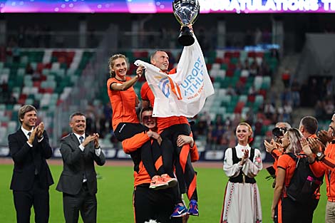 白罗斯体育与旅游部部长谢尔盖•科瓦利丘克将获胜者杯奖给欧洲团队。