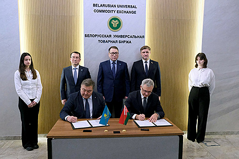 MINSK, 19 November (BelTA) – The Belarusian Universal Commodity Exchange (BUCE) and the QazTrade Center for Trade Policy Development have signed a cooperation agreement to advance exchange trade between Belarus and Kazakhstan and boost trade and economic ties between business entities of the two countries. The document was signed during a visit to BUCE by Minister of Trade and Integration of Kazakhstan Arman Shakkaliyev, the BUCE press service told BelTA.
