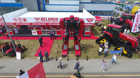 The Belagro expo showcases energy-efficient MTZ tractors equipped with the precision farming system: BELARUS-3525 on caterpillar tracks and 450hp BELARUS-4522. Also on display is BELARUS-1221 running on liquefied natural gas. Inviting visitors to the MTZ exposition area is a six-meter tractor-transformer.