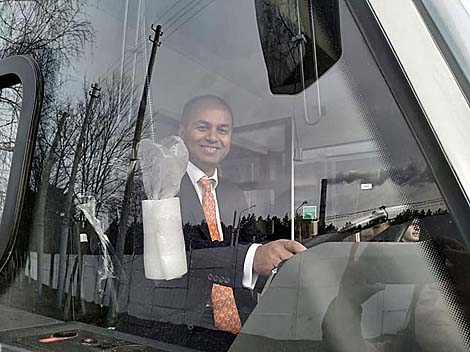 The message reads: “The first right-hand drive electric bus made by Belkommunmash is just back from trials and will soon be shipped to Nottingham. Regional Director at UK Export Finance Vomic Shah is behind the wheel.”