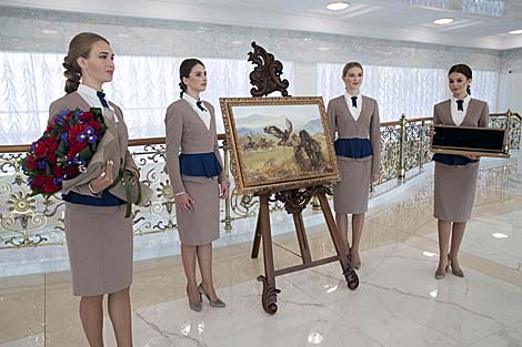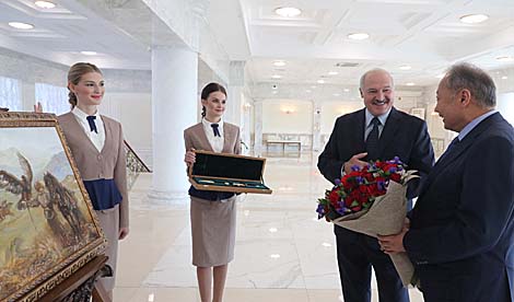The meeting was prompted by Kurmanbek Bakiyev’s 70th birthday, which he marked several days ago. In the Palace of Independence Aleksandr Lukashenko congratulated Kurmanbek Bakiyev and presented symbolic gifts. The picture Nomads Hunt With a Golden Eagle combines national peculiarities and ethnic zest of the Kyrgyz people. The golden eagle is a special symbol in the world view of the nomads. Kurmanbek Bakiyev was also gifted a dirk and a bouquet of Belarusian flowers.