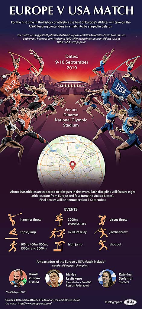 The athletics match between the teams of Europe and the United States will take place at Dinamo Stadium on 9-10 September 2019. Each team will comprise 152 athletes that will compete in 37 events.