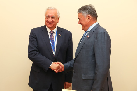 SAINT PETERSBURG, 13 October (BelTA) – Chairman of the Council of the Republic of the National Assembly of Belarus Mikhail Myasnikovich met with Vice Speaker of the Federation Council of the Federal Assembly of Russia Yuri Vorobyev on 13 October. The sides discussed preparations for the Fifth Forum of Regions of Belarus and Russia. The meeting took place on the sidelines of the CIS Interparliamentary Assembly and the CSTO Parliamentary Assembly in Saint Petersburg, BelTA has learned.